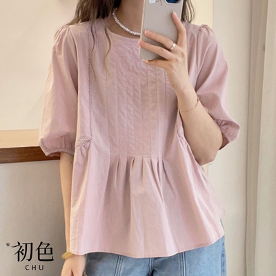 初色 氣質百搭純色圓領褶皺泡泡袖上衣短袖女上衣-共3色-35596(M-3XL可選)$5278折