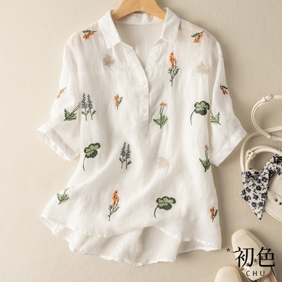 初色 復古棉麻風童趣花草刺繡襯衫短袖上衣-共4色-62644(M-2XL可選)$5508折