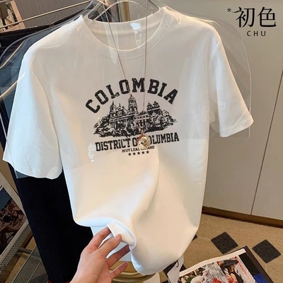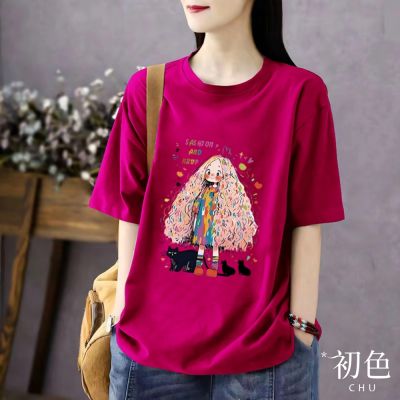 初色 圓領寬鬆休閒大碼顯瘦圖案印花短袖T恤上衣-共5色-33796(M-3XL可選)$269