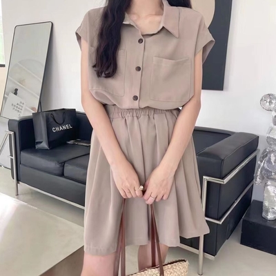 La Belleza簡約素色水洗棉短版排釦上衣+鬆緊腰闊腿五分短褲兩件式套裝$499