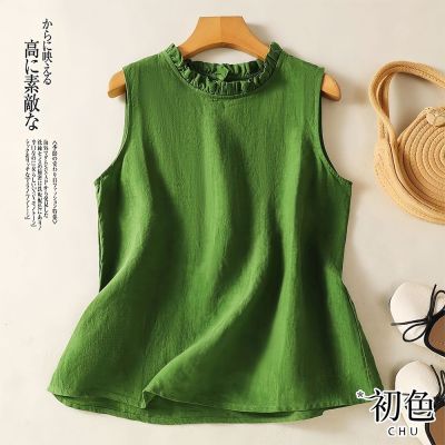 初色 復古棉麻風純色荷葉邊圓領無袖上衣女背心-共5色-12398(M-3XL可選)