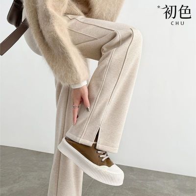 初色 純色人字紋毛呢開叉直筒修身休閒褲寬褲長褲-共2色-39699(L-4XL可選)
