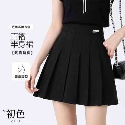初色 純色休閒百搭高腰A字裙半身裙百褶裙短裙-黑色-37657(M-2XL可選)