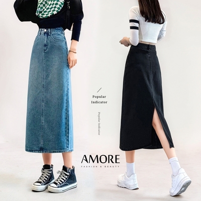 【Amore】經典氣質修身牛仔開衩長裙2色M-XL