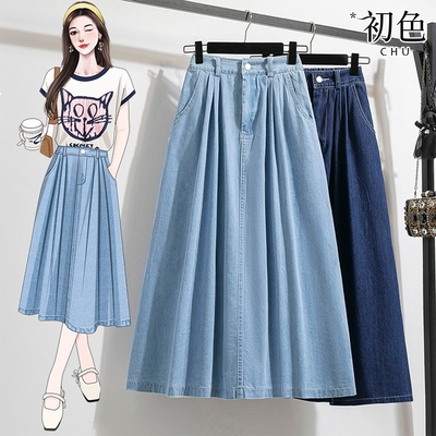 初色 休閒涼感簡約百搭薄款牛仔裙中長裙-5款任選-30060(M-2XL可選)