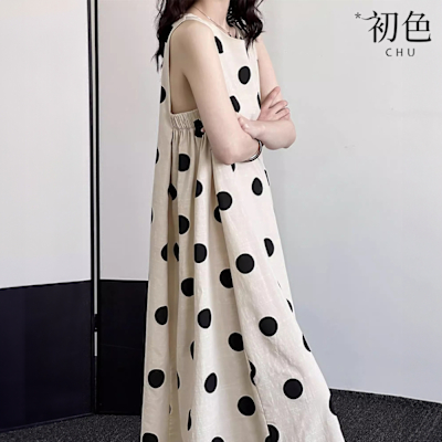 初色 韓系復古波點印花無袖挖肩簡約休閒連衣裙連身洋裝長洋裝-白底圓點-11828(M-2XL可選)$5388折