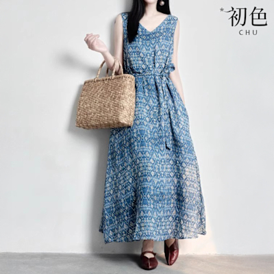 初色 文藝風圖騰印花綁帶顯瘦寬鬆無袖V領背心連衣裙連身洋裝長洋裝-藍色-11827(M-2XL可選)$5388折