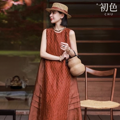 初色 素色褶皺收腰顯瘦無袖連身中長裙洋裝-共2色-30127(M-XL可選)