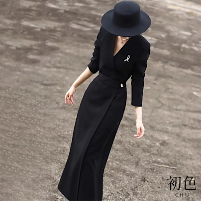 初色 時尚V領系帶收腰洋裝-共2色-63674(M-2XL可選)$399