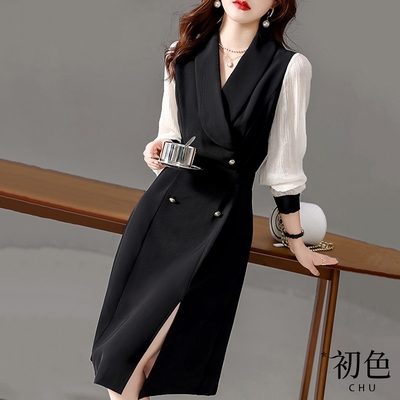 初色 拼接收腰系帶西裝開叉長袖洋裝-黑色-63607(M-2XL可選)$299