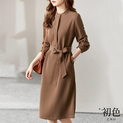 初色 立領燈籠袖收腰連身洋裝-咖啡色-64680(M-2XL可選)$349