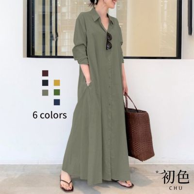 初色 翻領素色斜插口袋開衫長袖長裙連身裙-共6色-32558(M-2XL可選)