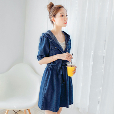 OB嚴選-高含棉經典牛仔排釦雙口袋腰抽繩連帽洋裝《DA4487-》