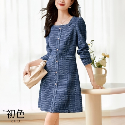 初色 牛仔波點方領長袖收腰顯瘦連身中長裙洋裝-藍色-30308(M-2XL可選)$399