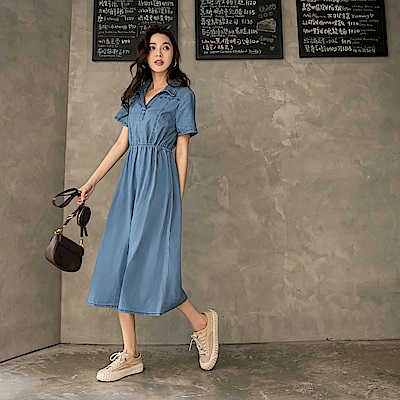 OB嚴選-高含棉翻領收腰綁帶傘襬短袖洋裝