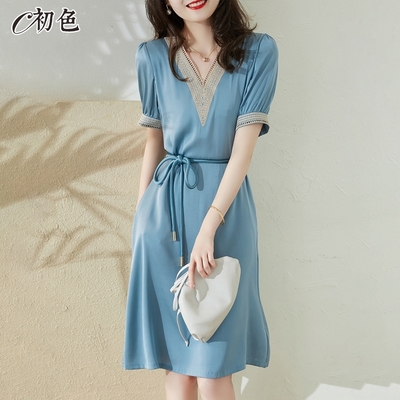初色 拼接蕾絲V領短袖收腰綁帶顯瘦中長連身洋裝-黑色-35001(M-2XL可選)$399