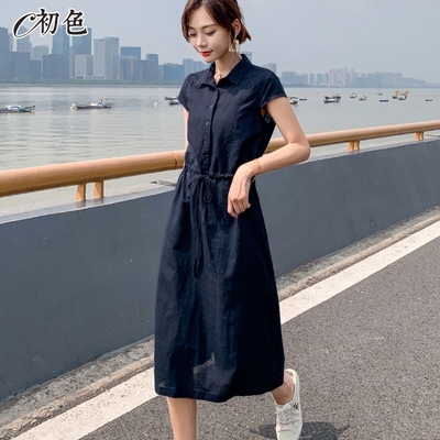 初色 純色繫帶棉麻風洋裝-共2色-96902(M-2XL可選)$349