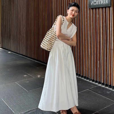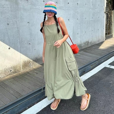 La Belleza性感內搭純色肩細肩吊帶螺紋棉質連身裙過膝吊帶大擺裙洋裝