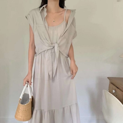 La Belleza簡約襯衫式背心綁帶上衣加細肩吊帶縮腰連身裙洋裝兩件式$499