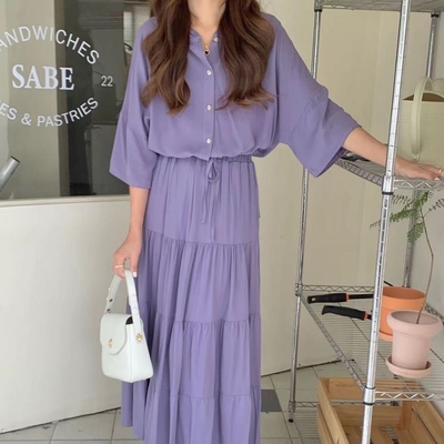 MOCO韓版寬鬆森林系長版純色泡泡燈籠袖氣質高腰連身裙洋裝