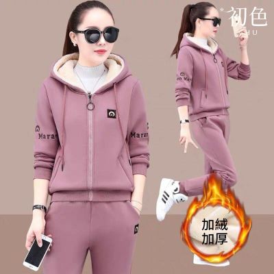 初色 印花長袖加絨連帽外套+鬆緊直筒褲長褲套裝-共3色-39657(M-3XL可選)
