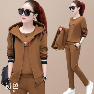 初色 圓領上衣女上衣+連帽拉鍊背心+運動長褲套裝-共4色-39656(M-4XL可選)