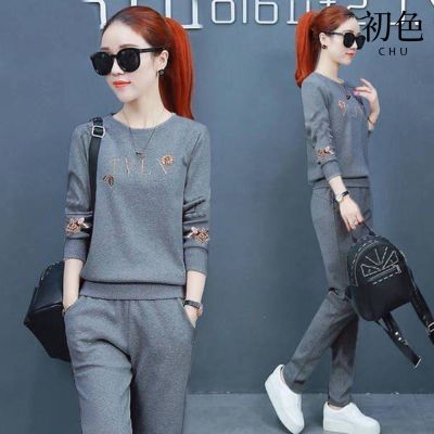 初色 拼色加絨加厚半高領長袖T恤+刺繡長褲套裝-共4色-39662(M-4XL可選)
