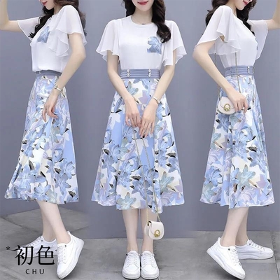 初色 雪紡荷葉袖圓領短袖T恤+碎花半身長裙套裝-共3色-34663(M-3XL可選)$299