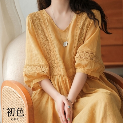 【初色】純色鏤空花棉麻風洋裝-共7色-61445(M-2XL可選)$349