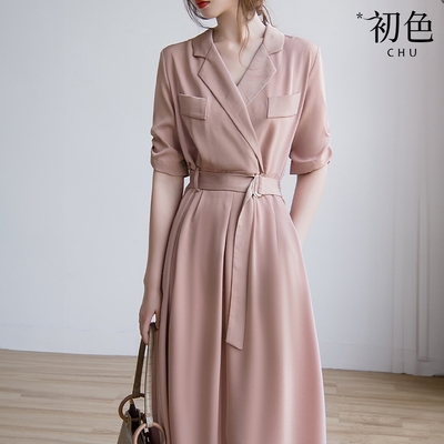 初色 西裝V字翻領收腰雙口袋連衣裙連身洋裝長洋裝-共2色-33820(M-2XL可選)$399