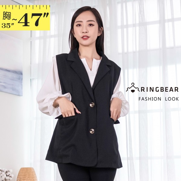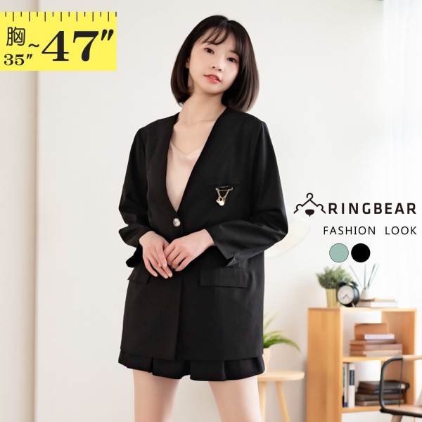 薄外套--韓系歐膩風鑰匙鏈胸針V領兩釦薄款西裝外套(黑.藍L-3L)-J373眼圈熊中大尺碼