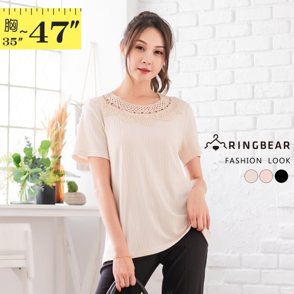 加大尺碼--顯瘦鏤空滾邊緹花布蕾絲細線針織圓領短袖上衣(黑.粉.米L-3L)-U614眼圈熊中大尺碼