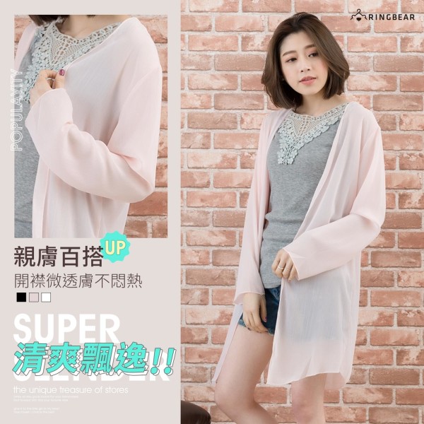 雪紡--飄逸氣質透膚開襟簡約剪裁直條雪紡罩衫(白.黑.粉XL-4L)-J214眼圈熊中大尺碼
