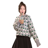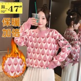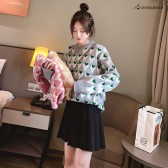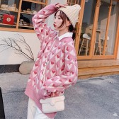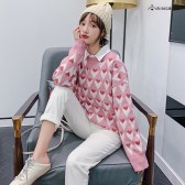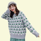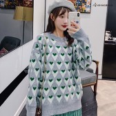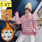 針織上衣--休閒修身顯瘦活潑可愛滿版撞色愛心長袖針織/毛衣(紅.綠M-3L)-X397眼圈熊中大尺碼
