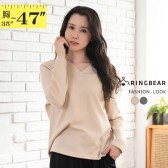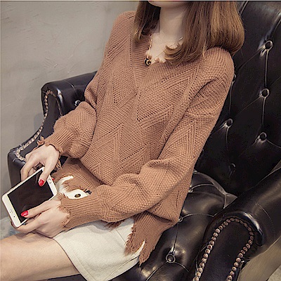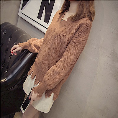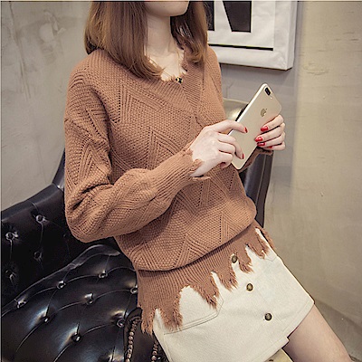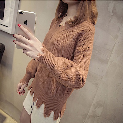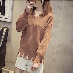 中大尺碼V領菱形毛毛邊下擺袖口破洞針織毛衣XL~4L-Ballet Dolly
