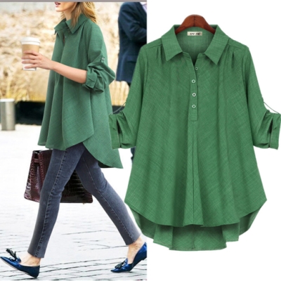 MOCOV領開釦袖荷葉打摺前短後長滑料襯衫L~4L