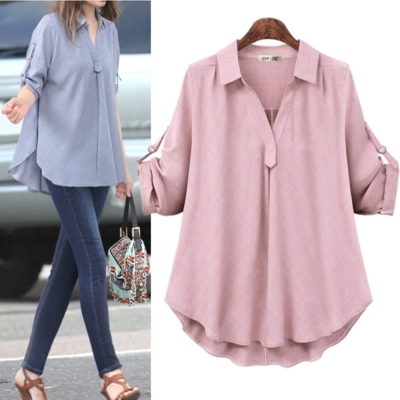 MOCOV領素色襯衫領袖提釦下擺傘狀寬鬆遮肚襯衫L~4XL