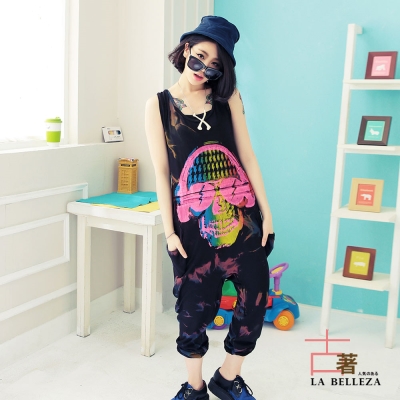 古著 耳機骷顱頭側口袋潑墨背扭結連身吊帶褲