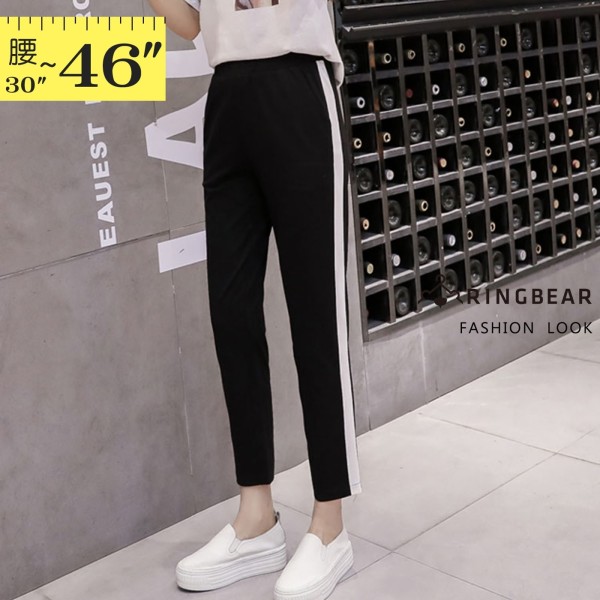 MOCO鬆緊腰側邊滾邊白色粗條紋褲腳缺休閒運動褲哈倫褲L~4XL