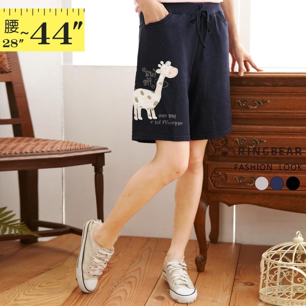 五分褲--童趣可愛長頸鹿貼布抽繩褲頭素面棉質短褲(黑.灰.藍XL-4L)-R92眼圈熊中大尺碼