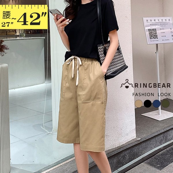 休閒褲--綁帶鬆緊褲頭兩側大口袋素面直筒五分褲(黑.藍.綠.卡其L-4L)-R247眼圈熊中大尺碼