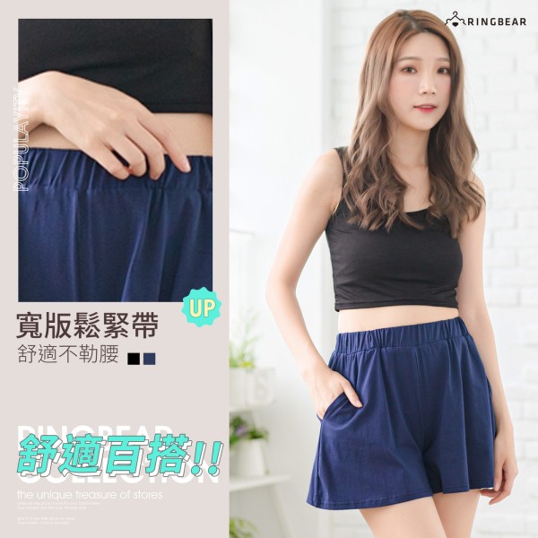 短褲裙--舒適百搭寬版鬆緊褲頭斜插口袋寬鬆棉質短褲(黑.藍L-4L)-R239眼圈熊中大尺碼