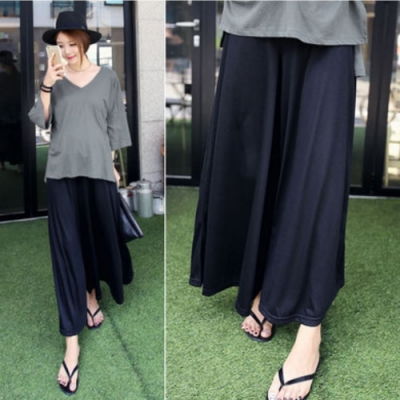 中大尺碼黑色鬆緊腰垂墜感闊腿褲彈性九分寬褲L~4L-Ballet Dolly