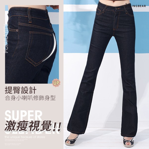 顯瘦--再創窈窕細身曲線-復古黑藍色瘦排骨中腰合身小喇叭牛仔褲(S-7L)-N88眼圈熊中大尺碼