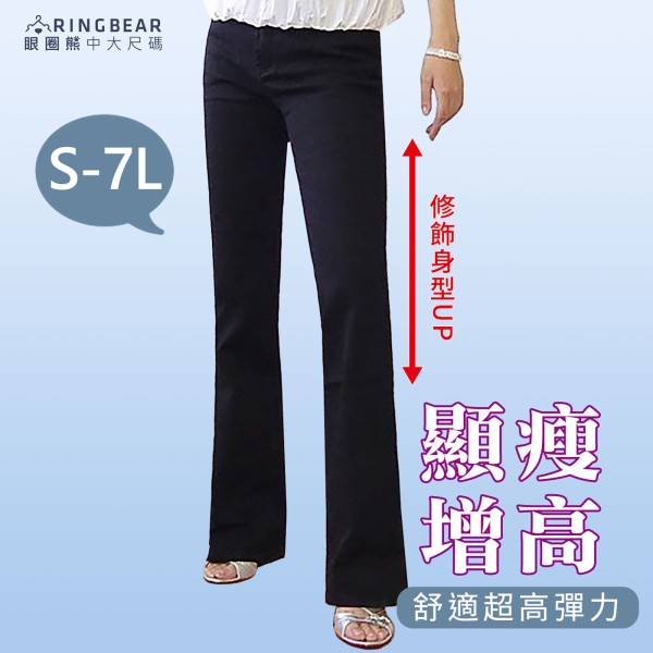 牛仔褲--絕對顯瘦素面側邊車線中腰小喇叭牛仔褲(S-7L)-N31眼圈熊中大尺碼
