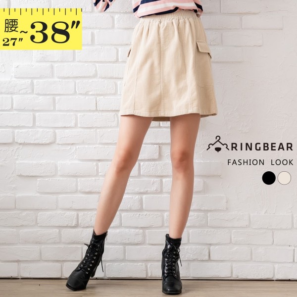 短裙--遮肉顯瘦鬆緊褲頭兩側大口袋附安全褲燈心絨A字裙(黑.卡其L-5L)-Q128眼圈熊中大尺碼