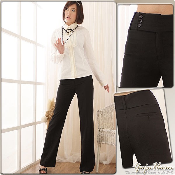西裝褲--日韓OL指定基本款黑色包釦中腰直統西裝褲(黑.咖S-7L)-P09眼圈熊中大尺碼