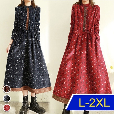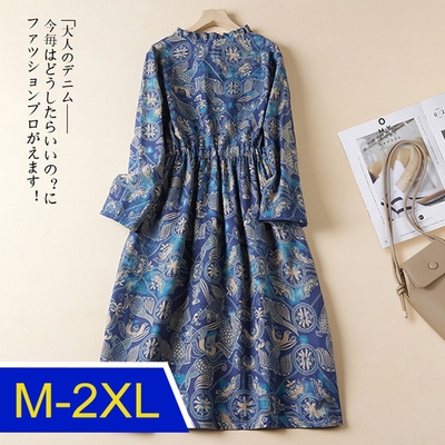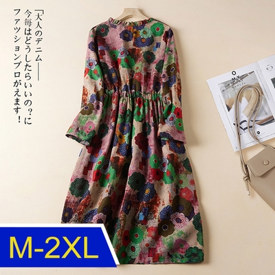 [韓國K.W.]正韓保暖夏日印花棉麻洋裝(中長裙/長袖洋裝/秋裝/新品)