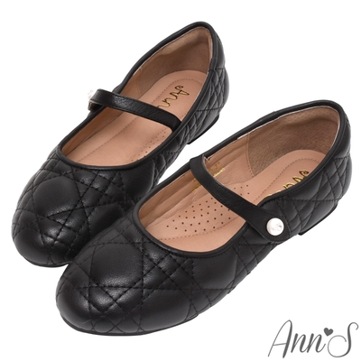 Ann’S小千金的單品-軟牛皮真皮珍珠扣瑪莉珍圓頭平底娃娃鞋-黑