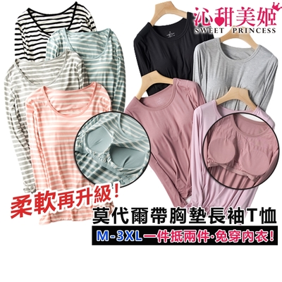 莫代爾帶胸墊長袖T恤家居服(大尺碼 BraT 睡衣 運動服/涼感舒適/寬鬆顯瘦/固定式胸墊/可拆式胸墊)$33583折